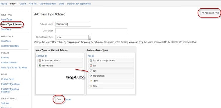 除了这两种问题类型方案,您还可以根据需要手动添加方案,例如,我们创建了一个IT 与支持方案,为此,我们将从可用问题类型中拖放问题类型到当前方案的问题类型中,如下方屏幕截图所示。