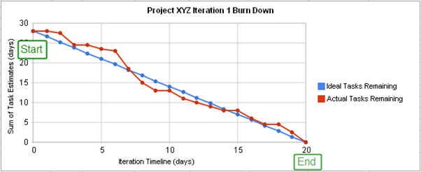为了在敏捷开发中跟踪进度,燃尽图显示了冲刺中实际和预估要完成的工作量。一个典型的燃尽图看起来有点像这样,其中红线表示实际剩余任务,而蓝线表示在 Scrum 周期中理想的剩余任务。