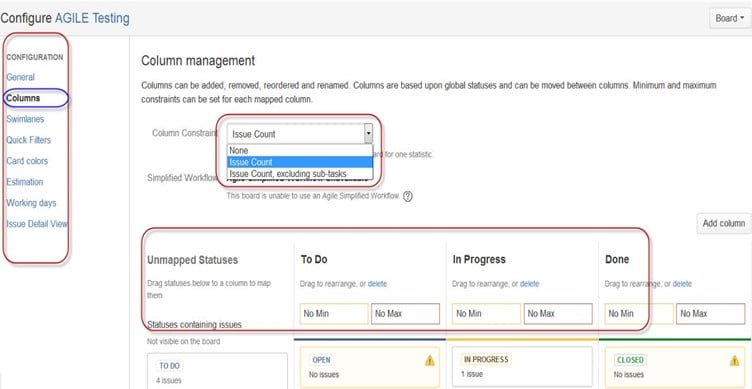 您还可以配置您希望如何查看 scrum 板。Scrum 板提供了多种选项,通过这些选项您可以更改您的板的外观。您可以使用 Scrum 配置各种功能,如列、泳道、快速筛选器、卡片颜色等。在这里,我们选择了列管理并选择了问题计数选项,它将显示进行中、待办或已完成的问题总数。在列管理中,我们可以根据需要添加额外的列,同样,您也可以在板上配置不同的功能。