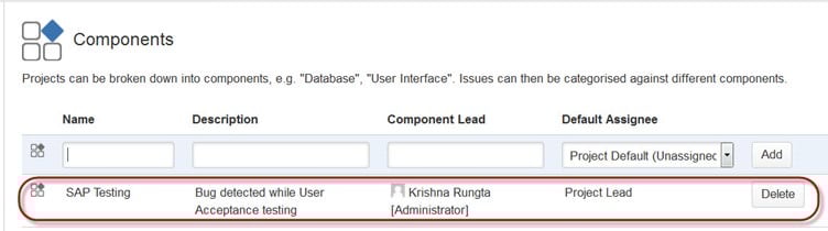 要添加新组件,如上图所示,您可以添加名称、描述、组件负责人和默认经办人。