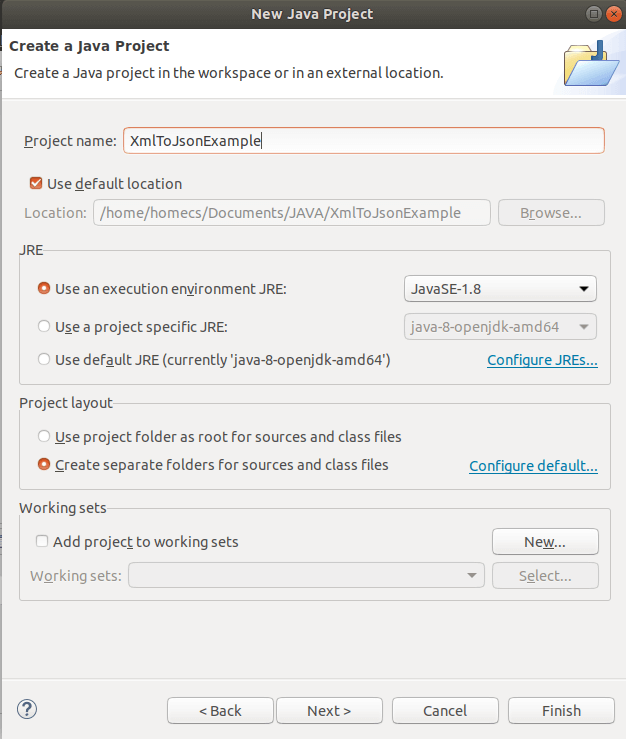 将项目名称设置为 XmlToJsonExample。
