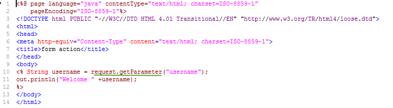 代码行 10-11: 这是操作 jsp,请求在此处处理,并且 username 从表单 jsp 获取。