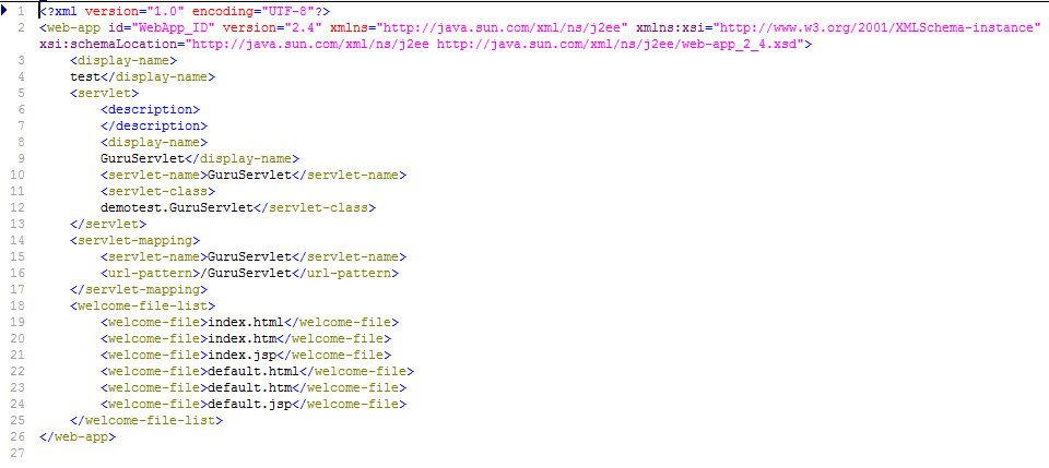 代码行 14-17: 在 web.xml 中,我们有 Servlet 到类的映射。