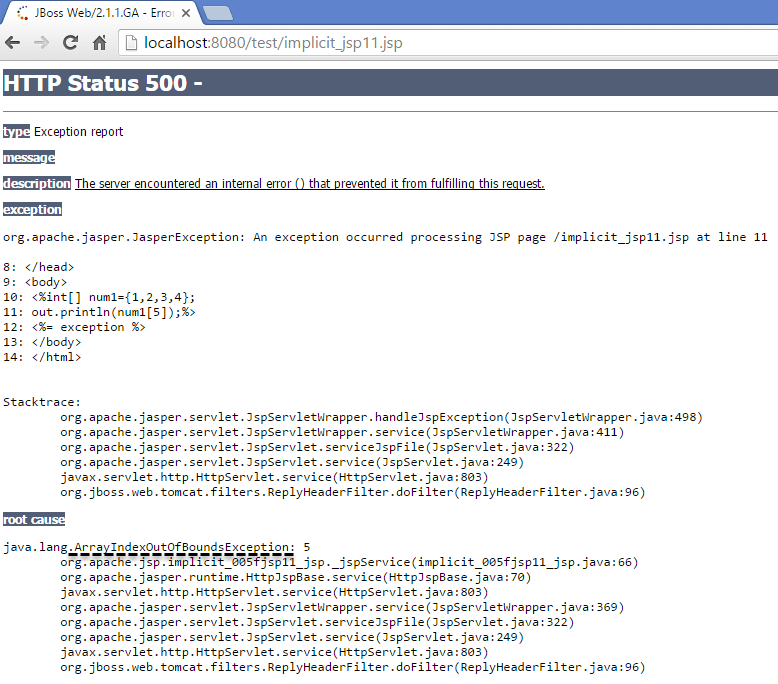 代码行 10-12 – 它有一个数字数组,即 num1,有四个元素。在输出中,我们尝试打印数组列表中未声明的数组的第五个元素,即 num1。因此,它用于获取 jsp 的异常对象。