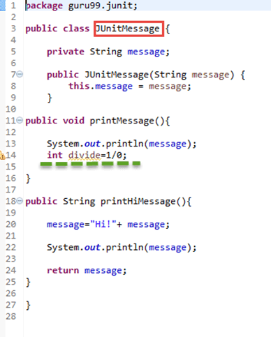 让我们通过创建一个抛出异常的 Java 类来理解异常测试。您将在测试类中处理并测试它。考虑 JUnitMessage.java 有一个方法,它根据用户收到的输入简单地执行数学运算。如果输入任何非法参数,它将抛出“ArithmeticException”。见下文