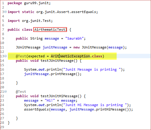 - 代码行 13:使用 @Test 注解创建我们的测试。当您执行上述类的方法时,它将调用数学运算。这里预期是算术异常,因此您将其作为 @Test 中的参数列出。