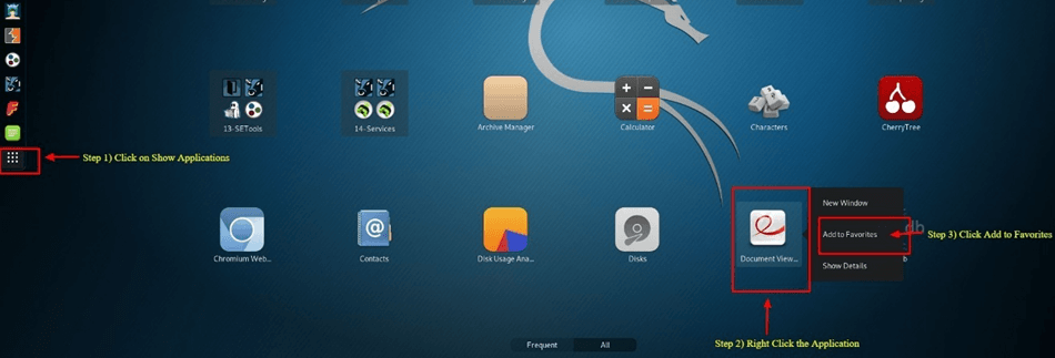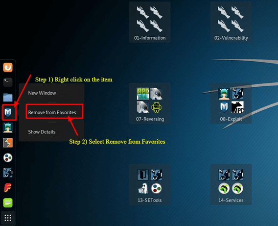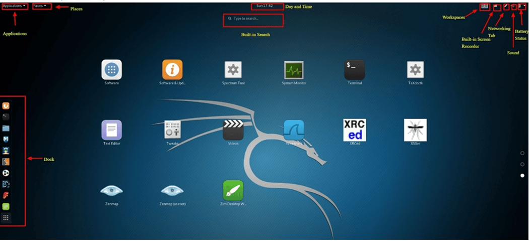 Kali Linux 任务栏 – 类似于 Apple Mac 的任务栏或 Microsoft Windows 任务栏,Kali Linux 任务栏提供了对常用/收藏应用程序的快速访问。可以轻松添加或删除应用程序。