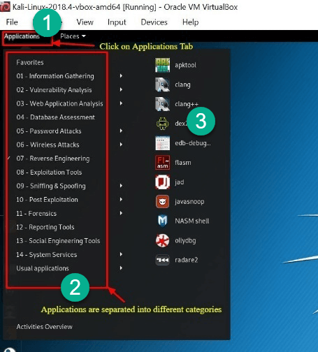 应用程序选项卡 – 提供预装在 Kali Linux 上的所有应用程序和工具的图形下拉列表。查看应用程序选项卡是熟悉功能丰富的 Kali Linux 操作系统的绝佳方式。在本 Kali Linux 教程中,我们将讨论两个应用程序:Nmap 和 Metasploit。应用程序被放置在不同的类别中,这使得查找应用程序更加容易。