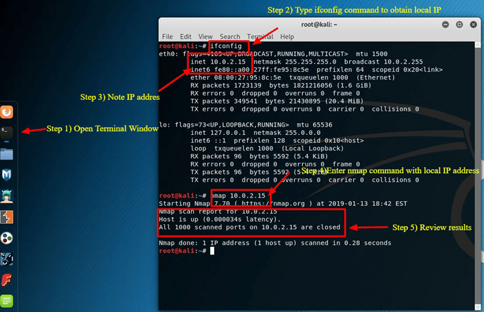步骤 2) 终端窗口将打开,输入命令 ifconfig,此命令将返回您的 Kali Linux 系统的本地 IP 地址。在此示例中,本地 IP 地址为 10.0.2.15