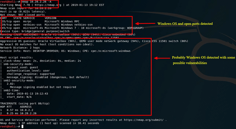 Nmap 的另一个基本但有用的功能是能够检测主机系统的操作系统。Kali Linux 默认是安全的,因此在本示例中,将使用安装了 Oracle VirtualBox 的主机系统作为示例。主机系统是 Windows 10 Surface。主机系统的 IP 地址为 10.28.2.26。