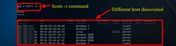 步骤 1) 假设 Metasploit 仍在打开状态,在终端窗口中输入 Hosts -R。这会将最近发现的主机添加到 Metasploit 数据库。