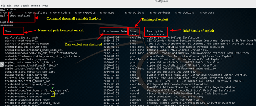步骤 2) 输入“show exploits”,此命令将提供 Metasploit 可用所有漏洞利用的全面视图。