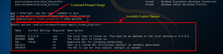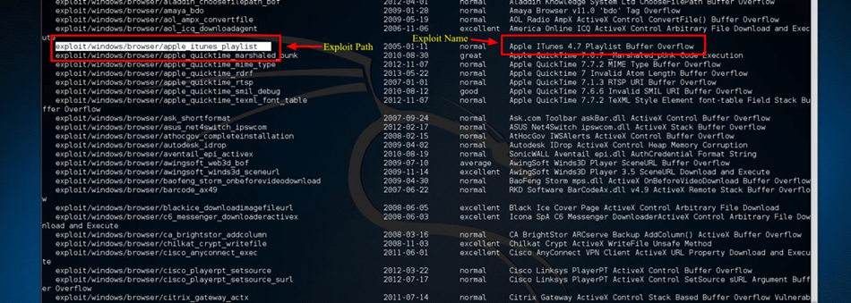 步骤 4) 为本教程的目的,我们将使用列表中发现的 Apple iTunes 漏洞。要利用此漏洞,我们必须输入列表中显示的完整路径:use exploit/windows/browse/apple_itunes_playlist