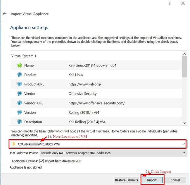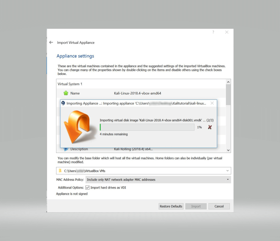 步骤 6) VirtualBox 现在将导入 Kali Linux OVA 虚拟设备。此过程可能需要 5 到 10 分钟才能完成。