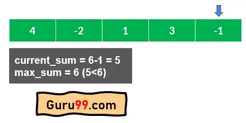 步骤 6) 对于数组的最后一个元素,我们有 -1。如果我们将其与 current_sum 相加,current_sum 将为 5,小于 max_sum。因此,max_sum 将保持为 6。