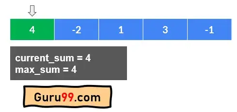 步骤 2) 在索引 0 处,值为 4。所以,current_sum = 0 + 4 或 4。此时 current_sum 大于 max_sum,max_sum 将为 4。