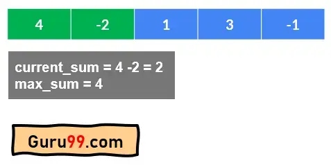 步骤 3) 在索引 1 处,值为 -2。所以,current_sum = 4 + (-2) 或 2。