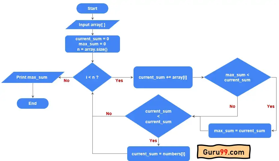 这是查找最大连续子数组和的简单方法的流程图。这是一种蛮力方法,因为我们遍历了所有可能的子数组。