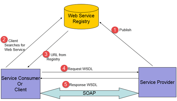 - 返回所需Web服务的URL和WSDL。使用WSDL和URL,服务提供商和请求方之间的通信通过SOAP消息进行。