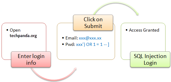 我们在 http://www.techpanda.org/ 上有一个简单的 Web 应用程序,**该应用程序出于演示目的易受 SQL 注入攻击**。上面的 HTML 表单代码取自登录页面。该应用程序提供基本安全措施,例如清理电子邮件字段。这意味着我们上面的代码不能用于绕过登录。