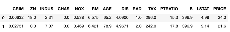 df.columns = boston.feature_names df['PRICE'] = boston.target df.head(2)
