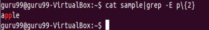 我们想检查字符“p”在一个字符串中连续出现正好 2 次。为此,语法是