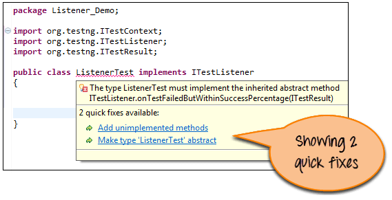 步骤 1) 创建实现“ITestListener”的类“ListenerTest”。将鼠标悬停在红色文本上,Eclipse 将为您提供 2 个快速修复,如下图所示