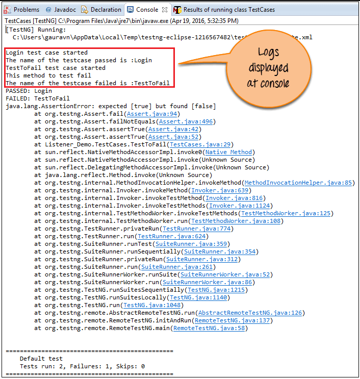 [TestNG] Running: C:\Users\gauravn\AppData\Local\Temp\testng-eclipse--1058076918\testng-customsuite.xml Login Test Case started The name of the testcase passed is:Login TestToFail test case started This method to test fail The name of the testcase failed is:TestToFail PASSED: Login FAILED: TestToFail java.lang.AssertionError: expected [true] but found [false]