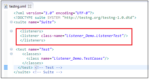 在这种情况下,我们可以创建 testng.xml 并在 XML 中添加 listeners 标签。
