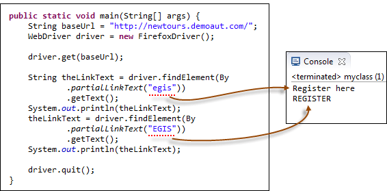 尽管这两个链接都包含字符序列“egis”,但其中一个“By.partialLinkText()”方法将根据字符的大小写分别访问这两个链接。请看下面的示例代码。