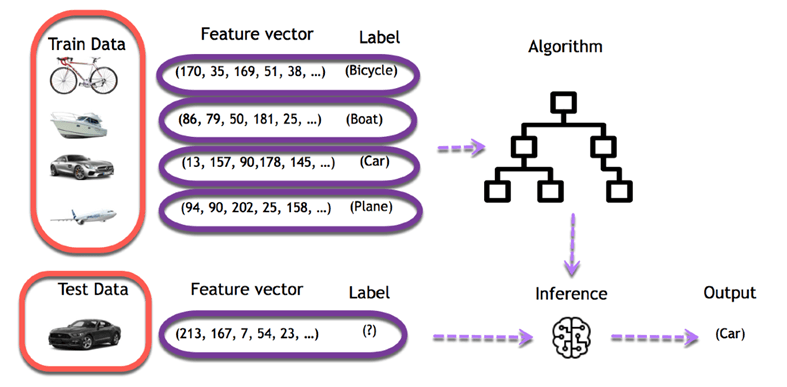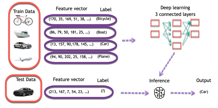 之后,就可以轻松地使用该模型来预测新图像了。对于输入到模型中的每个新图像,机器都会预测它所属的类别。例如,一个完全新的、没有标签的图像通过模型进行处理。对于人类来说,很容易将图像可视化为一辆汽车。机器利用其先前的知识也预测该图像是一辆汽车。