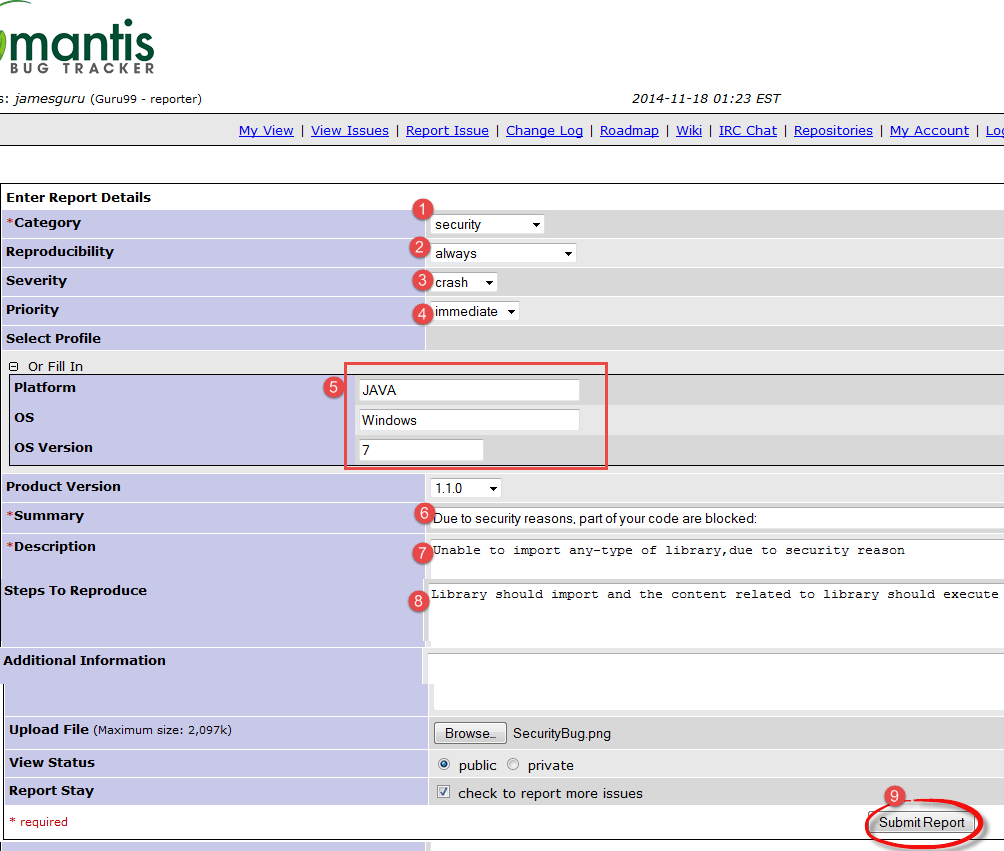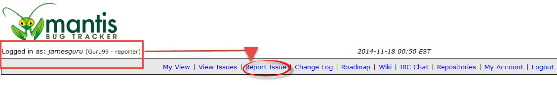 步骤 2) 登录 Mantis 后,您的用户名将显示在 Mantis 主屏幕的顶部,现在您可以通过点击如下所示的“报告问题”选项将您的问题报告到 Mantis 中。