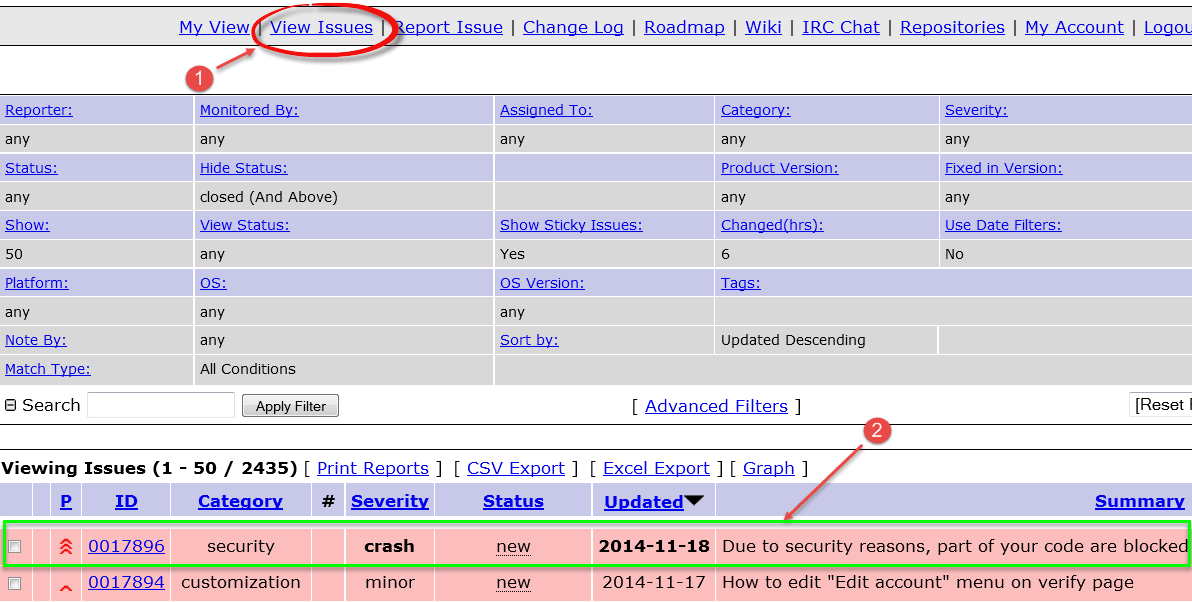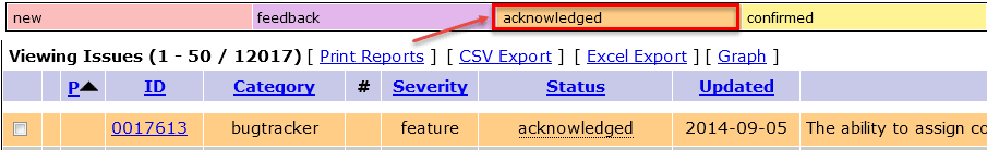 Mantis 工具中的问题会根据问题的状态进行高亮显示。例如,这里的问题处于“已确认”状态,因此用浅橙色高亮显示。