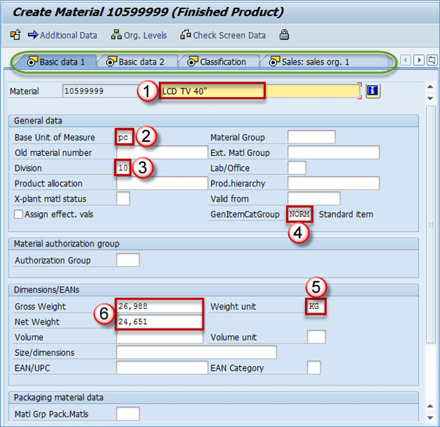 - 部门: 10 – 物料部门,您可以创建部门 10、20、30、40 分别用于成品、贸易商品、服务和其他物料,以便进行此类分类。由于它是成品,我们为物料选择了部门 10。