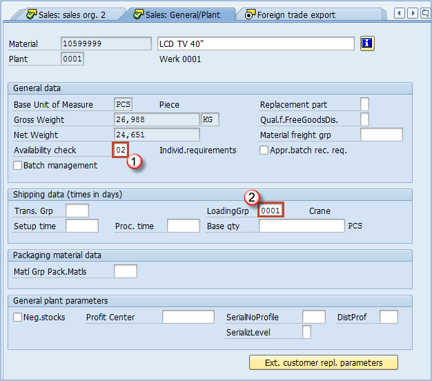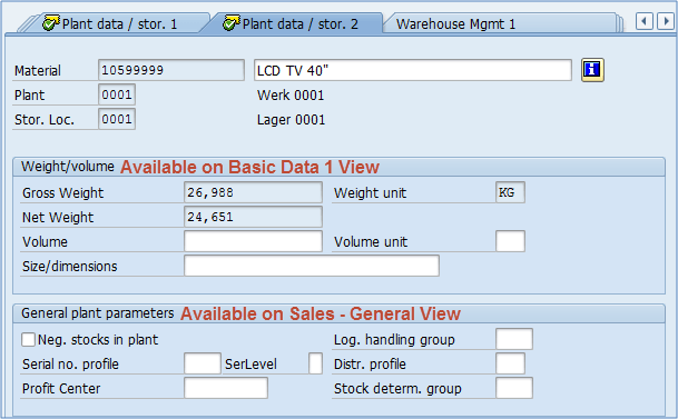 这些字段在基本视图 1(重量/体积部分)和销售 – 通用(通用工厂参数部分)中重复出现,我们在涵盖这些视图时已对其进行了描述。