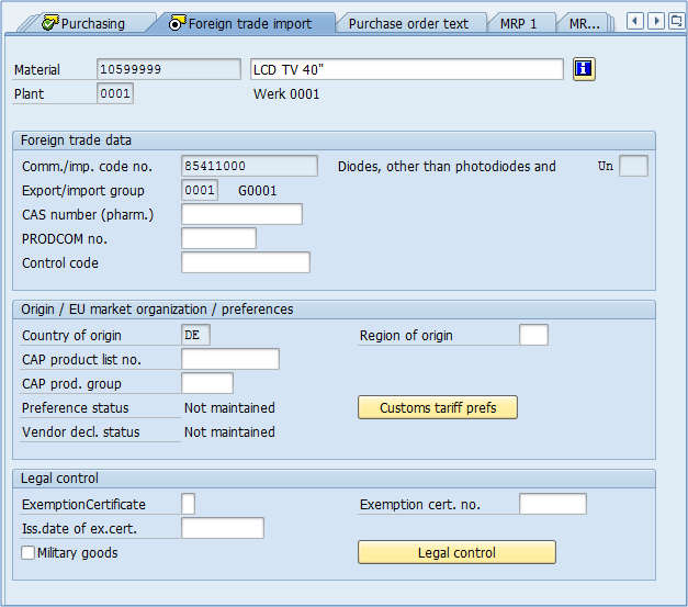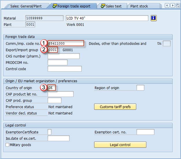 - 原产地区: 除了国家之外,您还可以定义国家中的一个地区(例如,巴伐利亚、黑森等)CAP 产品列表编号。– 如果适用,这是欧盟市场产品组列表中物料的编号。