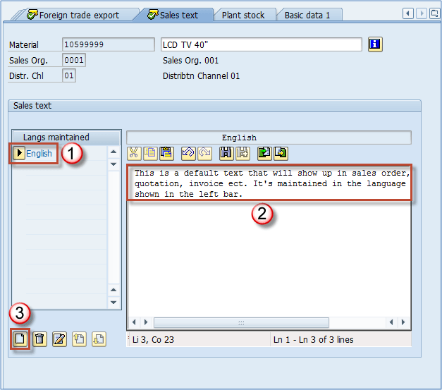 您可以为该物料定义多种语言的销售项目文本,用于销售文件。这可能是关于物料的一些一般性解释,或在分销渠道级别维护的解释。如果您维护此文本,它将显示在所有销售文件的项目级别,以及销售文件的打印版本中。