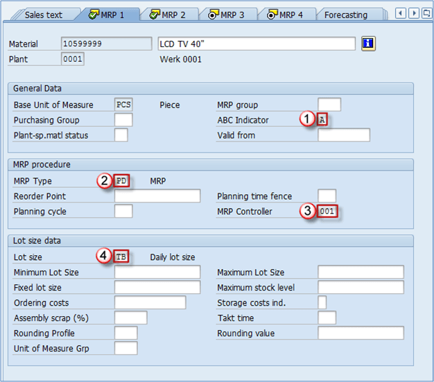 MRP 视图主要用于生产目的。这些信息由相应的 MRP 控制器或生产计划团队的其他人提供。MRP 1 视图中唯一的必填字段是计划类型。我们将更详细地介绍在生产环境中使用的最重要字段。