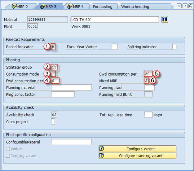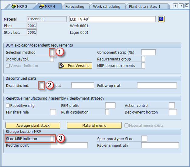 - SLoc MRP 指示器: 这是此视图中最强大的指示器。它告诉我们我们的存储地点(我们在组织级别屏幕中使用的 – 本例中为 0001 – Lager 0001)是否与 MRP 相关。这非常重要,因为它不仅可以反映 MRP,还可以反映 ATP(可承诺)数量。例如,如果我们使用默认值(空字段),则表示我们的存储地点在 MRP 运行中被考虑在内。ATP 也将其考虑在内,因此销售部门可以看到该地点可供销售的库存。另一方面,如果您选择指标 1 – 存储地点库存排除在 MRP 之外,则此库存将不会为 MRP 运行考虑,也不会对客户(ATP)可承诺,因此无法销售。如果您选择指标 2 – 单独管理存储地点,则表示您希望单独管理此地点库存与工厂库存(在某些罕见情况下很有用)。最明显的用途示例是拒收存储地点。当我们的 LCD TV 40″ 下线时,它可以完全正常工作,或者可能存在缺陷。如果准备销售,我们将将其转移到我们的 0001 地点,销售部门将看到可供销售的数量。假设我们生产了 3000 台电视机。其中有 10 台电视机存在一些问题,我们的质量控制部门选择这些电视机无法销售,因此它们被发送到我们的 0003 拒收地点。在 MRP 4 视图中,我们必须为拒收地点 0003 维护指示器 1,因为我们不希望销售部门看到可用库存。我们只希望另外 2900 件在 0001 地点可用,对于这些地点,我们维护的此指标字段为空(包括在 MRP/ATP 中)。