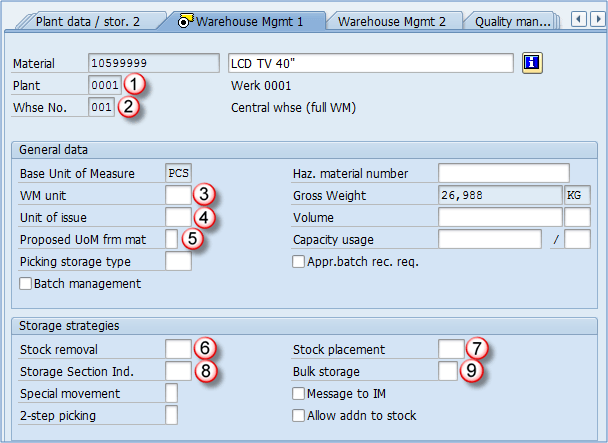 - 存储类型: 我们正在扩展/维护其物料的存储类型。在这种情况下,我们希望我们的 LCD TV 存放在货架存储中(我们已在 WM 1 视图中选择此策略)。