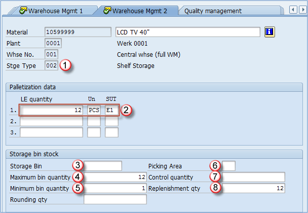 - 最大仓数量: 这通常是货盘化数据中维护的一个数字,在我们的例子中是 12 PCS。在检查库存放置时使用,系统不允许在单个仓中存储超过 12 PCS。物料主数据中的仓库管理 2 视图