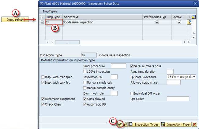 - 检查设置: 这指示是否至少设置了一种检查类型。在设置本身中,您可以选择要用于该物料的检查类型。设置类型必须由您的 QM 顾问预先定义。步骤 A:单击“检查设置”按钮;步骤 B:选择 QM 团队预定义的适当检查类型;步骤 C:确认更改。