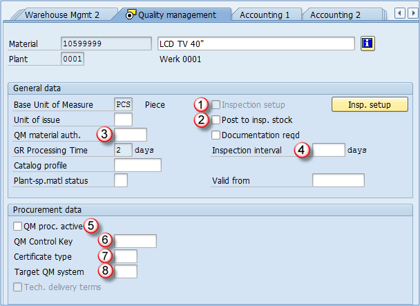 - 过账到检查库存: 指定物料是否需要进行质量检查。如果选中此项,将为指定的检查类型创建检查批次。