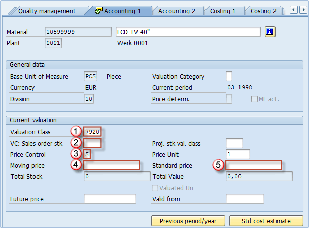 此视图中输入的数据决定了该物料的会计处理方式。数据由您的 FI/CO 团队提供,并且由您的 FI/CO 顾问进行后台定制。