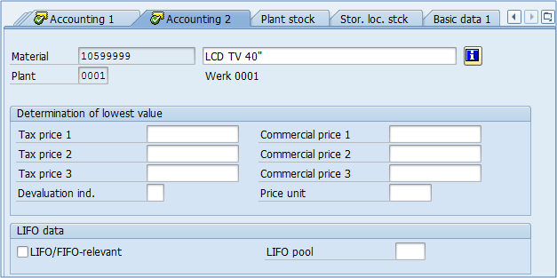 此视图在生产环境中并不经常使用,此视图最常见的设置是留空所有字段。基本上,它由会计中的特殊税收信息组成,这些信息很少相关。确定物料的最低价值、通过其状态(移动、慢速移动)进行物料减值等。如果您的财务会计部门使用此视图,则该部门应向您提供维护此视图的信息。