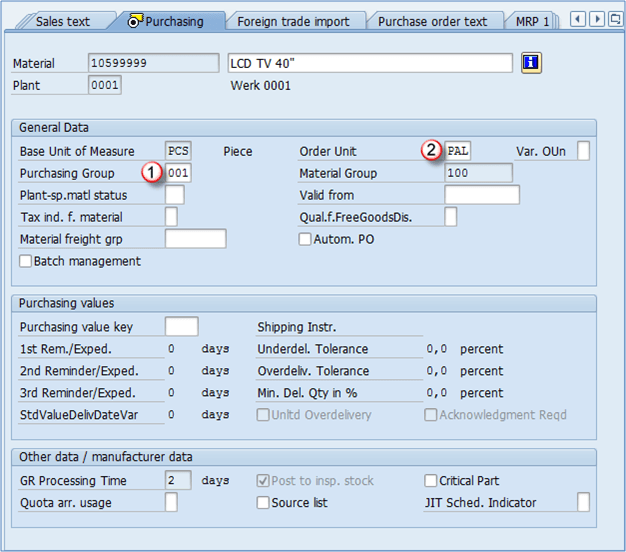 - 采购组: 您可以定义各种采购组,如原材料采购、贸易商品采购、服务采购等。此值将是采购单据中输入的所有项目的默认值。