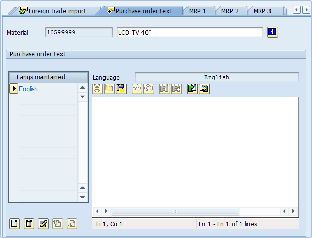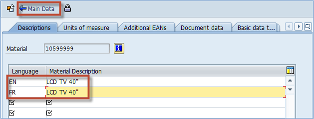附加数据中的第一个选项卡是关于物料描述。您可以看到我们已经在基本视图 1 中维护了物料描述,但我们只为默认语言(此会话中用户的登录语言)定义了描述。在附加数据中,我们可以为任何其他需要的语言定义描述。例如,我已为法语创建了描述。在我们的例子中,两种语言的物料描述相同(在其他情况下,您可能需要翻译描述)。这很重要,因为如果您有一个法国客户,他们只接受法语产品名称,您必须在此处定义它,并将该客户的通信语言设置为法语(这在 SD 模块中完成,是 MM 和 SD 集成利用的点)。替代计量单位的维护在第二个选项卡中使用。您可以看到有一个记录为 1 PCS,等于 1 PCS,这是我们基本 UOM 的记录。另一个是 1 PAL 等于 12 PCS – 这意味着我们的公司将 LCD TV 40″ 打包成每托盘 12 件。您可以根据需要添加任意数量的替代 UOM,也可以使用“删除行”按钮删除它们。在这里,您还可以维护所有计量单位的所有 EAN 代码。在 SD 模块中,您可以使用物料主数据中维护的任何计量单位创建销售订单。所以实际上创建 12 件或 1 托盘的销售订单是相同的。