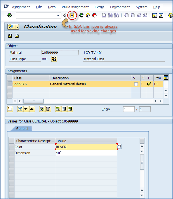 通过选择物料类别 – 001,您将为该类别类型扩展物料。现在我们必须添加一个我们想用于我们物料的类别。一个名为通用的类别可以由两个特性组成:颜色和尺寸,或者您在对物料进行分类或在 MM 模块或其他模块中搜索它们时可能需要的任何内容。将类别分配给物料后,您可以维护该类别包含的特性。在本例中,我们有一个名为通用的类别,它包含颜色和尺寸特性。我们可以填写相应的字段。