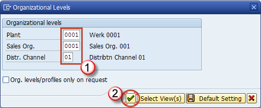当您选择此视图时,将出现一个包含组织级别的屏幕。在这里,您可以选择要为哪个工厂、销售组织和分销渠道扩展您的物料。