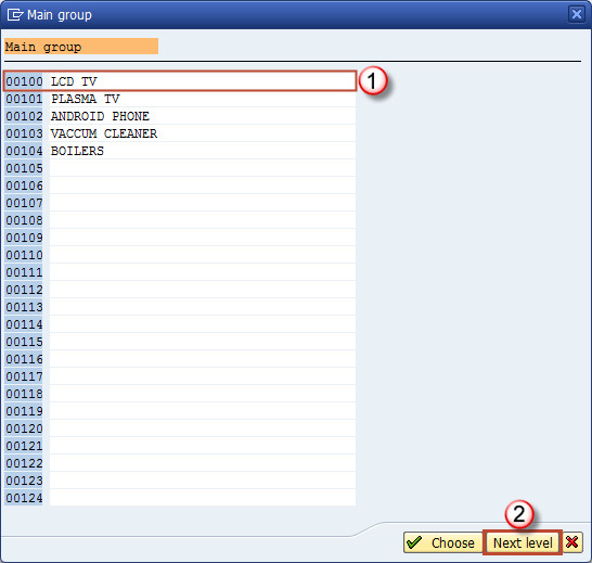 - 项目类别组: 它从 2 – 通用项目类别组字段复制,但这是分配给特定分销渠道的类别组。与字段 2 不同,它可以更改,通过此字段您可以管理同一物料在不同渠道的销售中的使用方式。例如,您可能希望一个物料在海外销售活动中具有不同于默认值的项目类别。主要根据 SD 团队的指示进行更改。产品层级 – 从预定义列表中选择合适层级:您可能已经想过产品层级有多难维护。您只看到一堆数字。很难知道哪些数字适合特定物料。除了销售和分销团队应向您提供此信息这一事实外,还有一种浏览所有层级的简便方法。当您按下显示字段可能条目的按钮时,您会进入此屏幕。